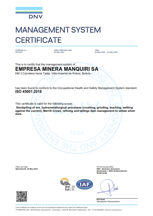 Con el fin de crear y promover un entorno de trabajo seguro, nos esforzamos en minimizar los riesgos de daños, accidentes y enfermedades profesionales, esquematizando los requerimientos internos y externos necesarios para asegurar un sistema efectivo de gestión del ambiente de trabajo. De esta manera Empresa Minera Manquiri logró la CERTIFICACIÓN con base en los requerimientos de la norma ISO 45001:2018, enfocados en la evaluación de riesgos y oportunidades, la consulta e integración de nuestros trabajadores.